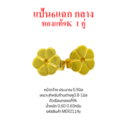 แป้นต่างหู6แฉกกลาง 1คู่ ทองแท้9k 37.5%